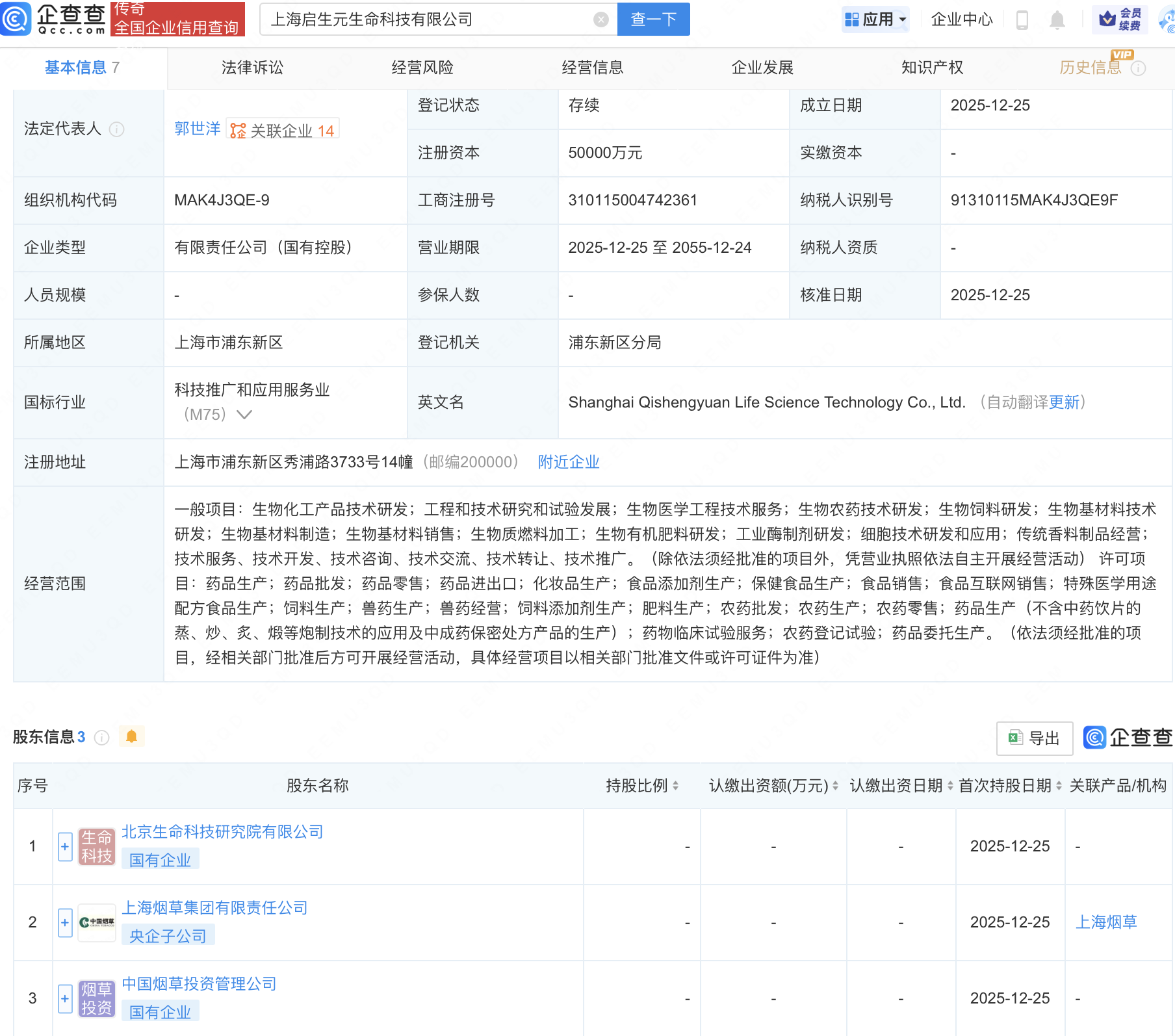 近日佳禾配资,上海启生元生命科技有限公司成立,注册资本5亿元,经营范围包含:生物医学工程技术服务;生物农药技术研发;生物饲料研发;生物基材料技术研发;生物基材料制造等。企查查股权穿透显示,该公司由上海烟草集团有限责任公司、中国烟草投资管理公司、中国烟草总公司旗下北京生命科技研究院有限公司共同持股。